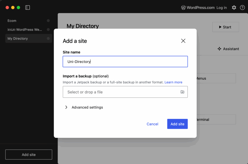 2. Run Local → “Create a new site” → pick a name (e.g., uni-directory) → choose Preferred environment (default) → set WP username/password (remember them).