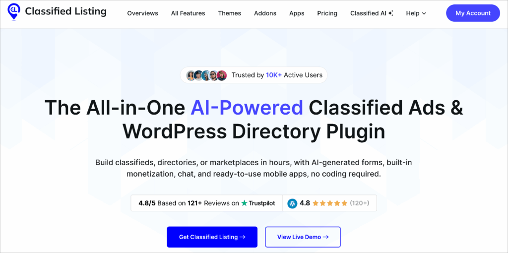 Classified Listing by RadiusTheme is a purpose-built classified ads and business directory plugin that has emerged as a serious competitor in recent years. With over 10,000 active installs and a 4.8-star rating on WordPress.org, it’s particularly well-regarded for its affordability, ease of use, and strong classified ads functionality.