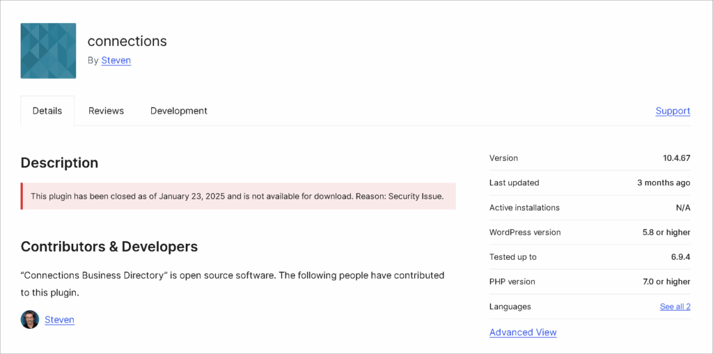 We need to flag an important update: Connections Business Directory was closed from the WordPress plugin repository on January 23, 2025, due to a security issue. This means the plugin no longer receives updates through WordPress.org, and its continued use poses a security risk to any site running it.