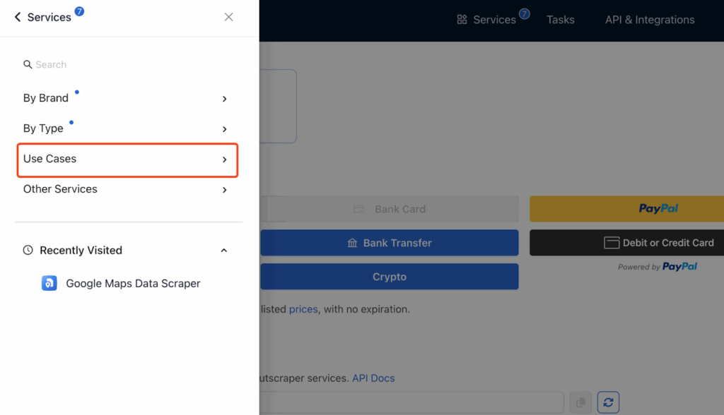 Log in to your Outscraper account. Click on Services, then choose Use Cases from the menu.