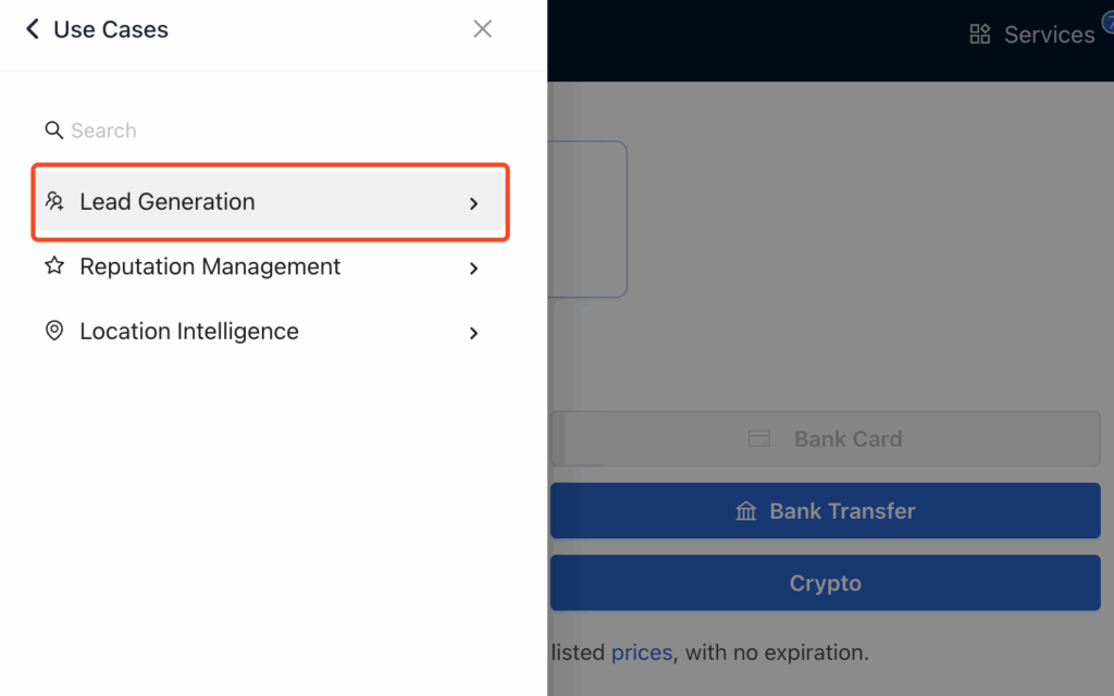 You will see several options like Lead Generation, Reputation Management, and Location Intelligence. Choose Lead Generation because this is where you can collect real business data.