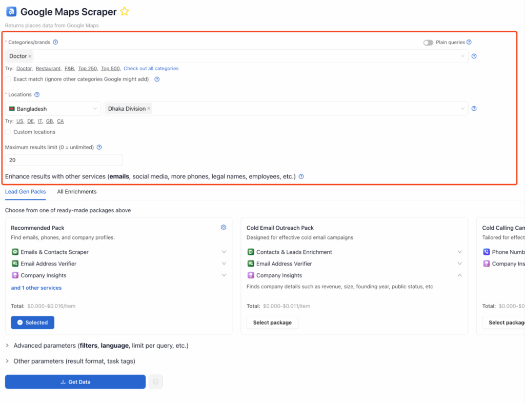 You can also add extra information such as emails or company insights by selecting add-on packs. When ready, click Get Data.