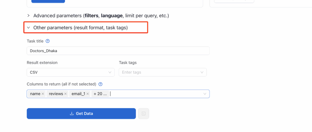 Before running the task, give it a title. Set the result type to CSV and select which columns you want to include, such as name, reviews, or email, etc. Click Get Data again to start. After a short time, download the CSV file to your computer.