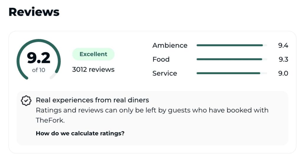 Just like the above example from TheFork – a restaurant listing and booking website that uses advanced review criteria for restaurants combining ambience, food and service altogether to provide the potential customers of a restaurant a clear picture. It also illustrates the number of users rated the place, an average rating on a scale of 10 giving the restaurant owner an insight on where to improve.