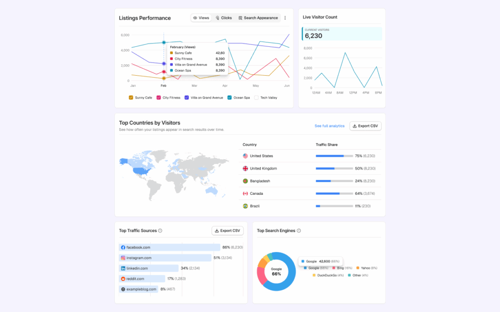 Accurate numbers help to make more accurate decisions. And accurate decisions help to grow business faster. The analytics extension provides a clear visual dashboard that shows your top-performing listings, user activity, and growth – all in one place. Both admins and listing owners get access to these insights, helping them make data-driven decisions that lead to smarter marketing and better conversions.