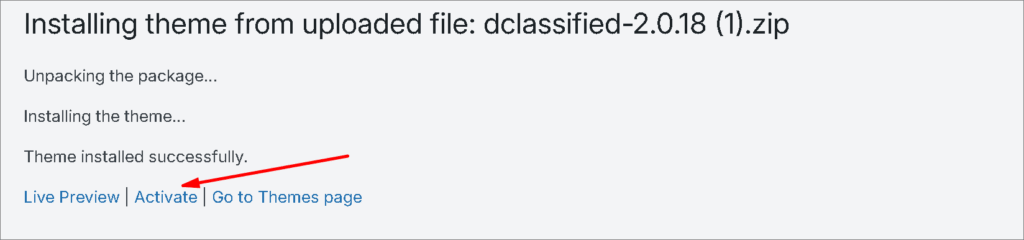 Then click on Upload Theme > Choose File and select the ‘dClassified.zip’ > Install Now.