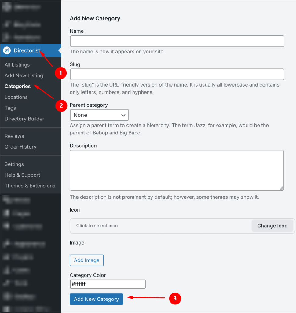 To do so, navigate to the Directorist > Categories > Fill out the fields and make sure to hit the “Add New Category” button.