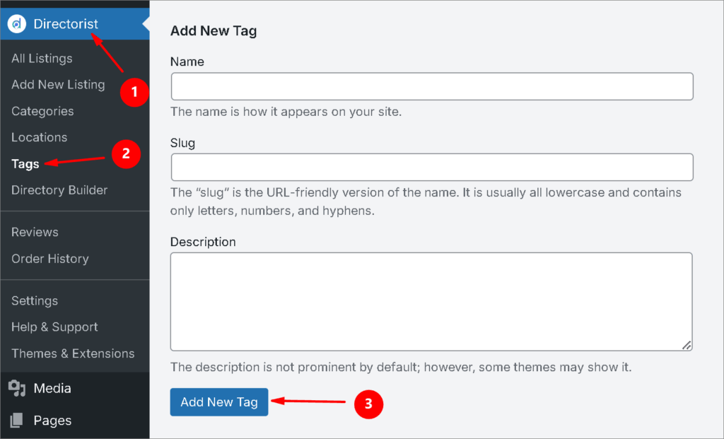 Similarly, you can add tags so that the visitors can find their desired item as fast as possible. You can do it from Directorist > Tags > Enter Credentials > Add New Tag.