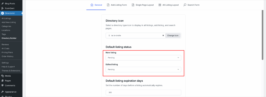 The good news is you can even control an edited listing’s default status. That means you can make an already published listing’s status ‘pending‘ whenever the owner edits it with the “Edited Listing Default Status” option as shown in the above screenshot.