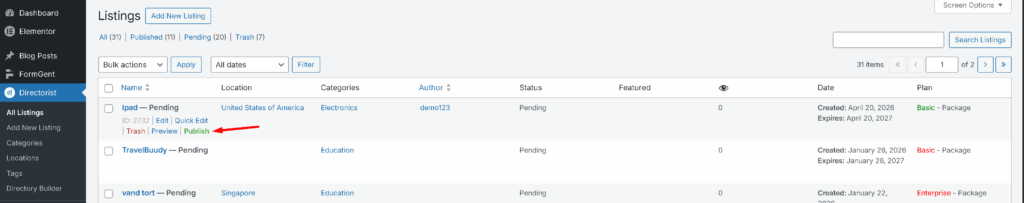 To review & publish an ad, navigate to Directorist > All Listings > Hover over the Pending Listing > Hit the ‘Publish’ button.