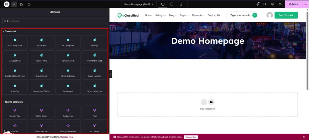Elementor is a popular website builder. You can also enjoy the drag-and-drop feature with the dClassified theme. Just click the “Edit with Elementor” option, and you’ll be redirected to the editor page. While enjoying drag-and-drop, the dedicated blocks from dClassified make your website-building experience more exciting.