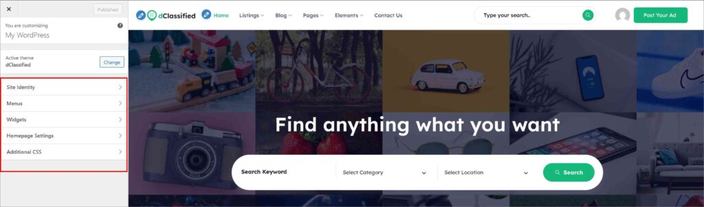 As the theme already offers a default classified template hope that you don’t need major changes without some little tweaks like text, logo, fonts, colors and images. You can make all these tweaks from WP Dashboard > Appearance > Customize.