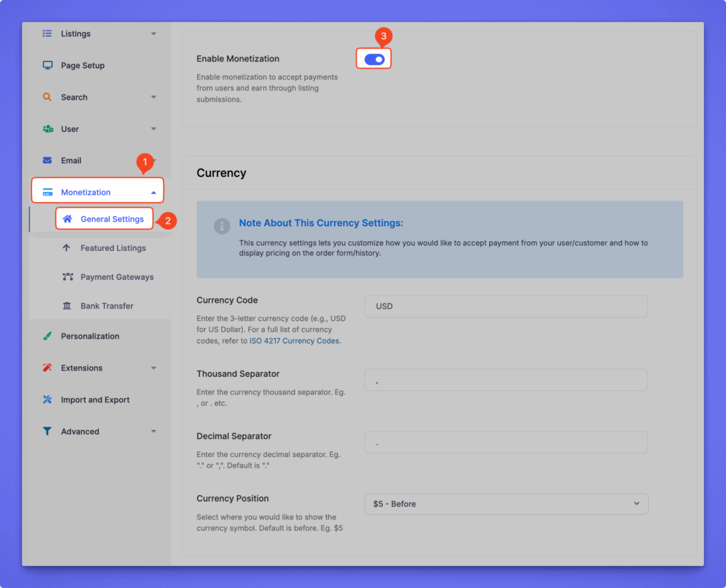 - Go to Directory Listings → Settings → Monetization → General Settings.