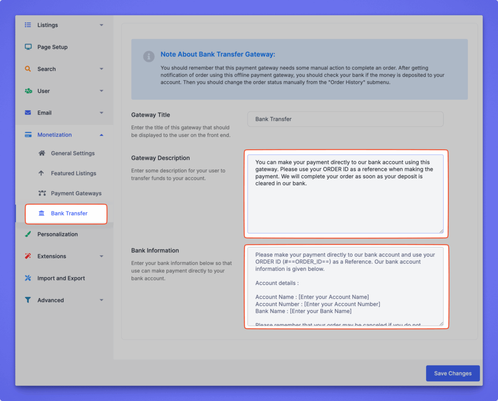 The Bank Transfer gateway allows users to make manual payments directly to your bank account. This method is included in the Directorist core plugin and does not require any additional extension.