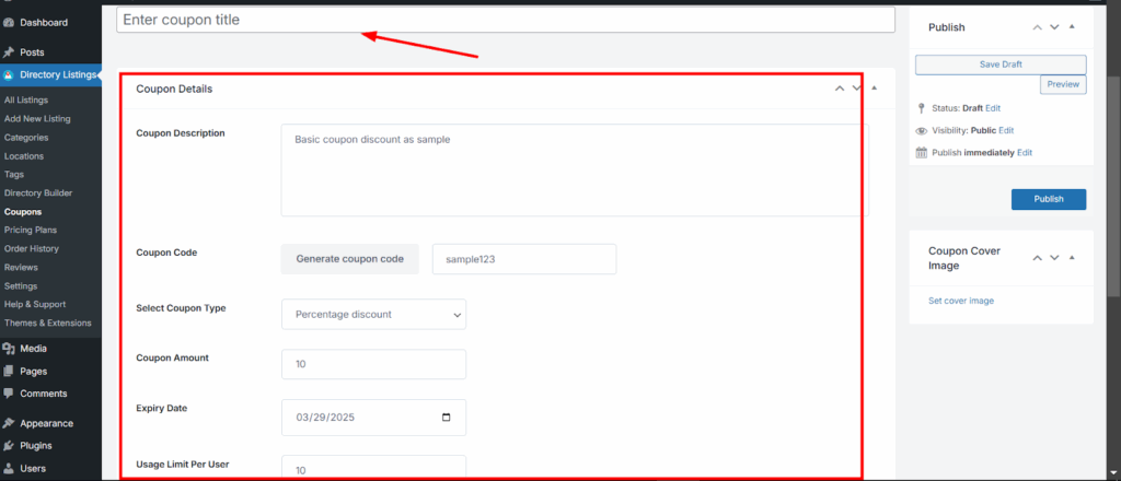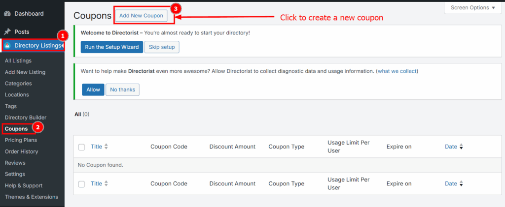- Navigate to Directory Listings → Coupons → Add New Coupon.