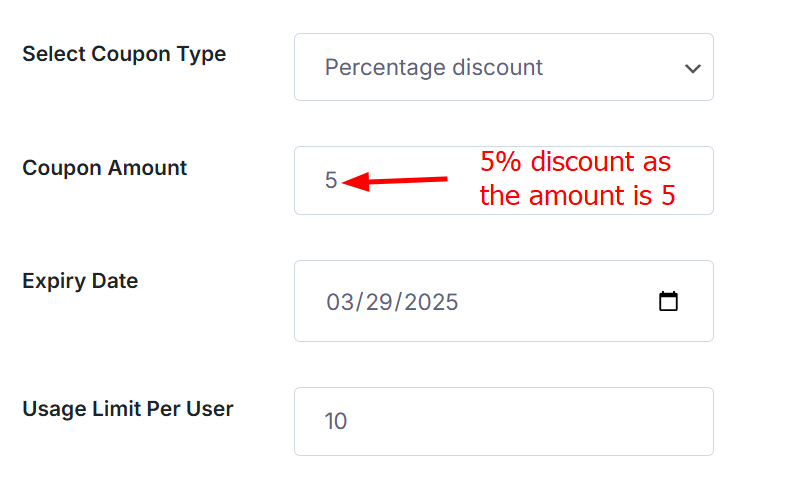 - You set a percentage value (e.g., 10%, 25%, 50%). When the coupon is applied, that percentage is subtracted from the overall price.