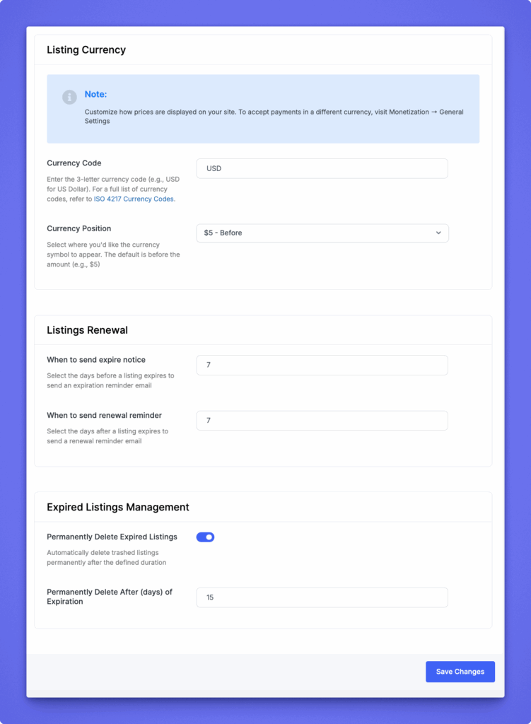 To accept payments in a specific currency, go to Monetization → General Settings.Listings Renewal #