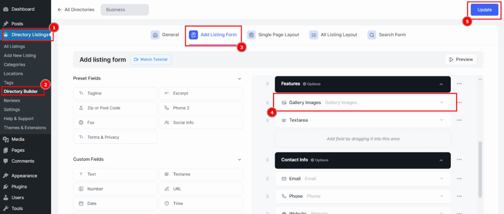 - Path: Directory Builder > Add Listing Form
