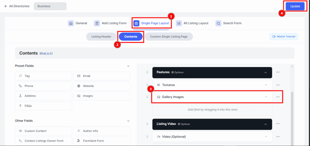 Follow these steps to add and display the Gallery Images field in your directory builder: