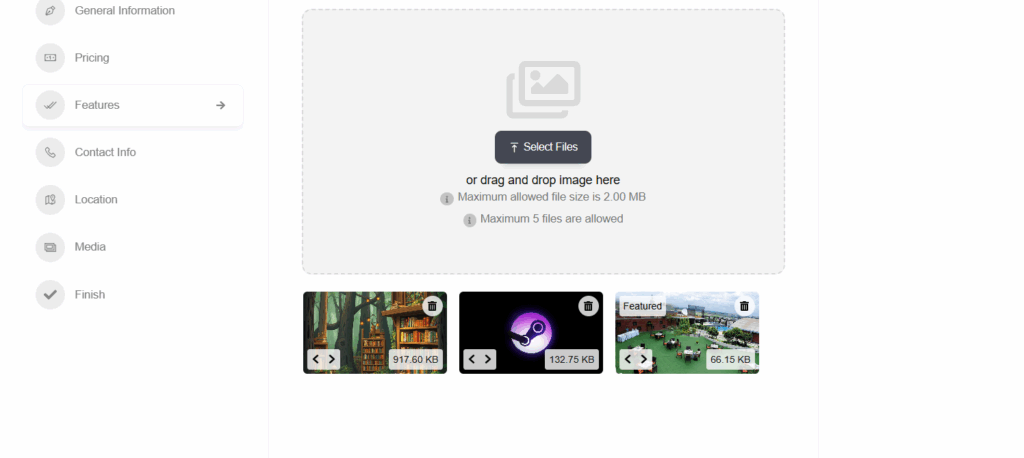 When creating or editing a listing, owners can upload multiple images directly from the Add Listing form. They can add, remove, and reorder images before publishing to ensure the gallery looks exactly how they want.
