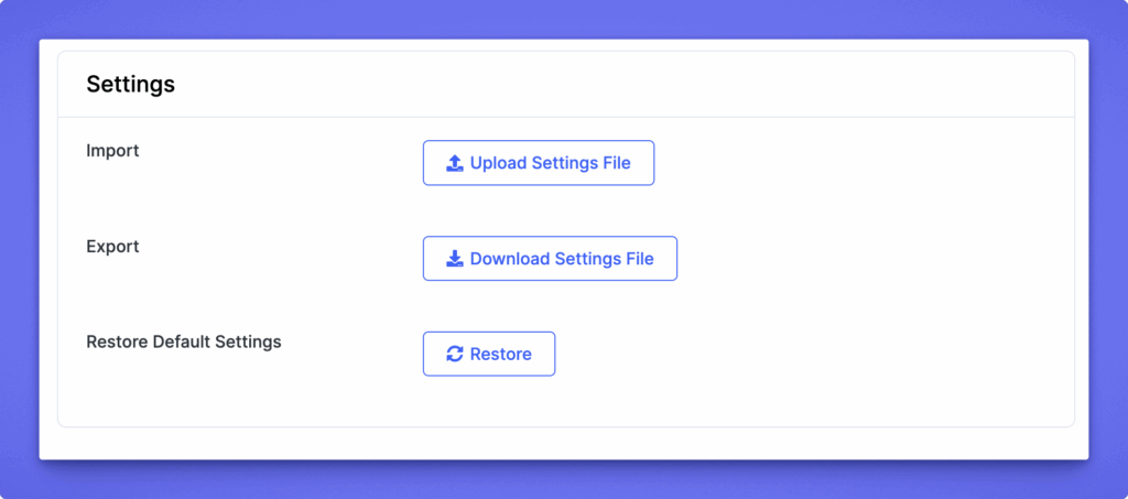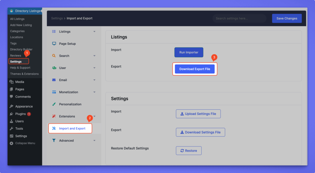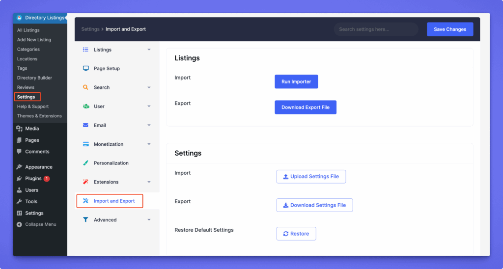 In addition to managing listings, Directorist lets you back up, transfer, or restore your plugin settings. These settings are exported and imported as a JSON file. This is useful when moving configurations between sites or creating backups before making changes.