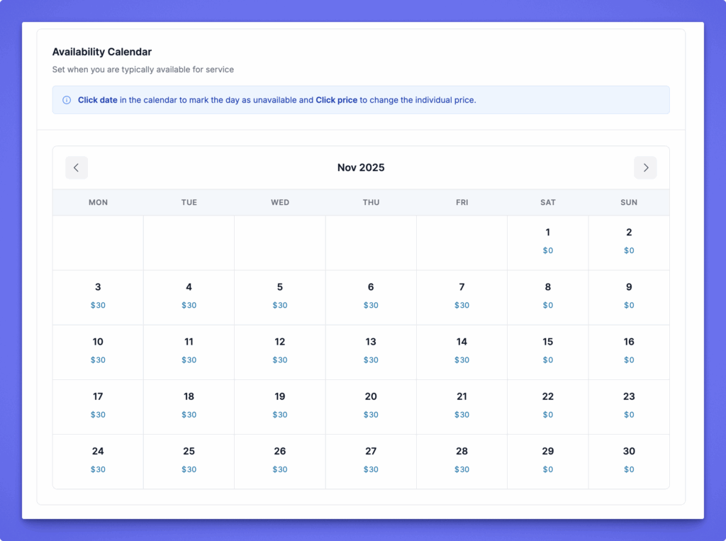 The calendar automatically shows each day’s price and reflects weekend pricing rules unless overridden manually.