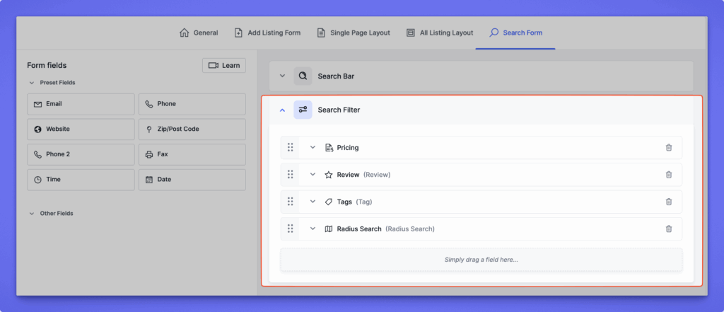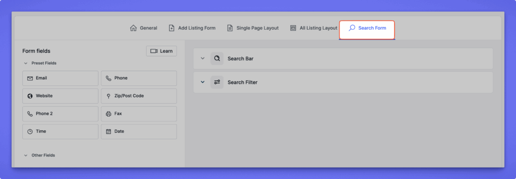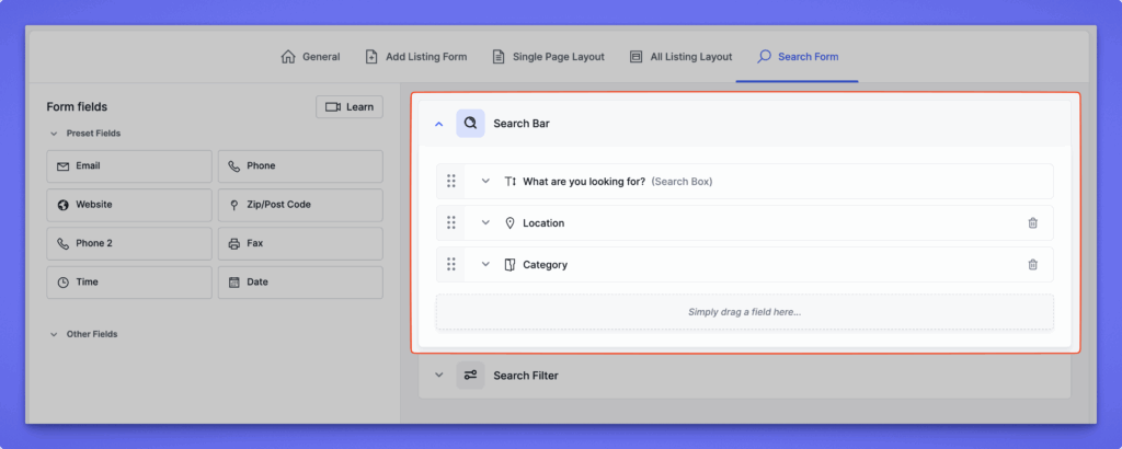 The Directory Builder controls the search form fields, meaning the actual elements inside the search form such as “What are you looking for?”, “Location”, “Category”, or any custom field. Each directory type can have its own unique search structure.
