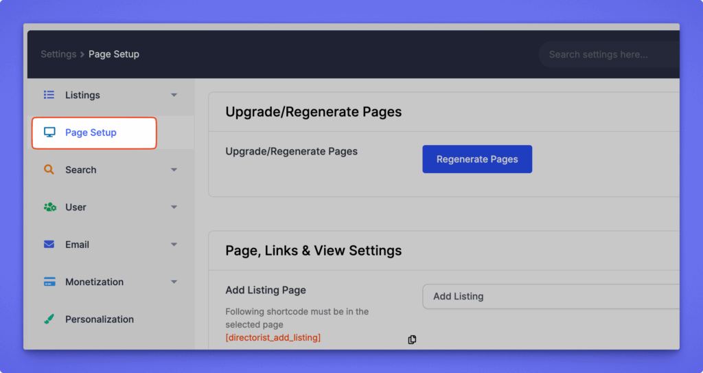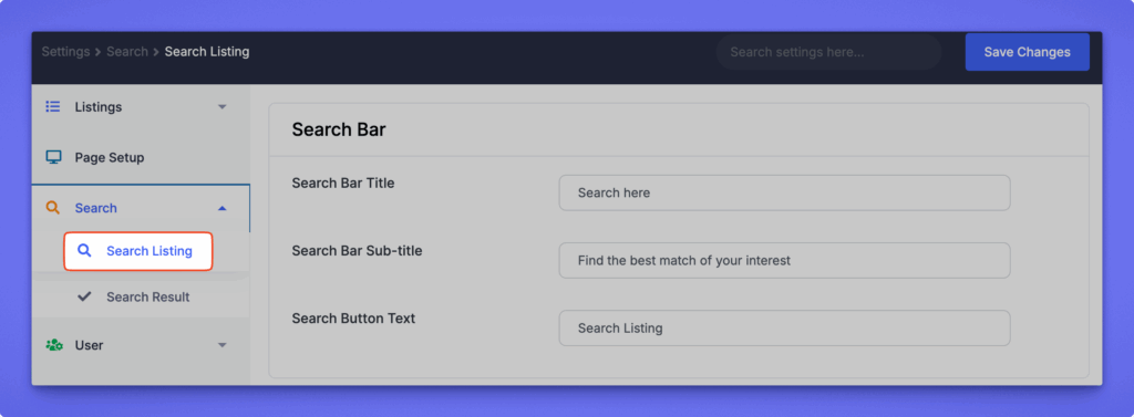 These settings are found under: Directorist → Settings → Search → Search Listing