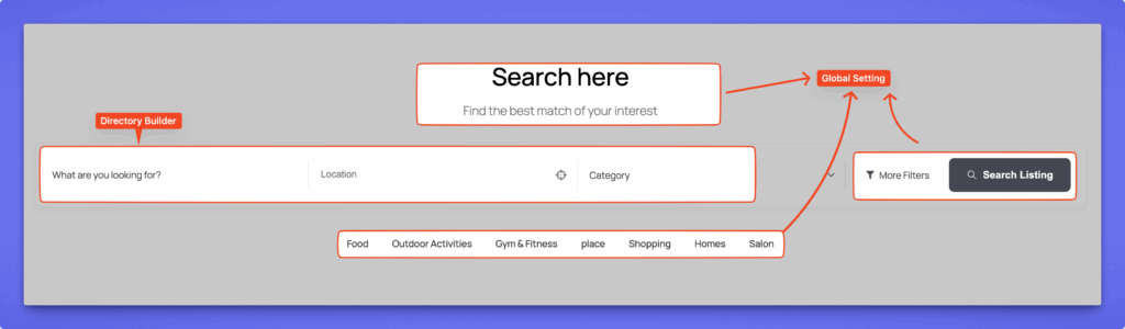 The Search Listing Settings control how the search section appears and functions on your directory’s search results page. In Directorist, search behavior is divided between two configuration areas: Global Settings and the Directory Builder, each responsible for different parts of the search experience.