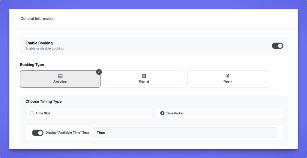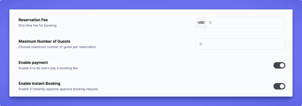 Turn this option on to allow bookings for the listing. When disabled, all booking fields remain hidden, and users cannot request or schedule a service.