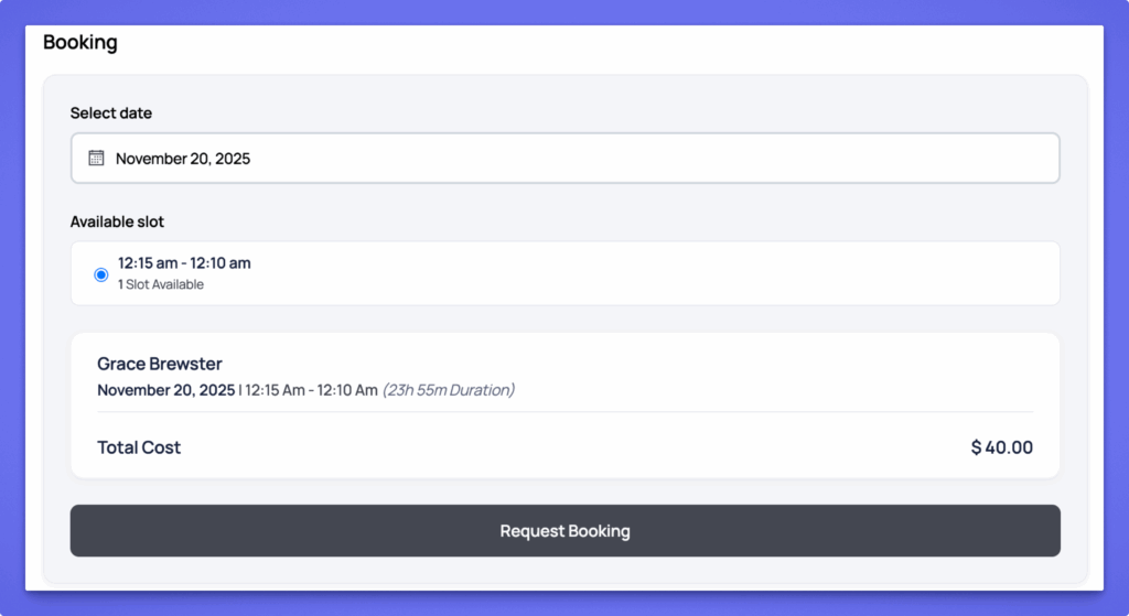 The user clicks Confirm Booking to complete the reservation. Based on your settings, the booking is either confirmed instantly or sent for manual approval.