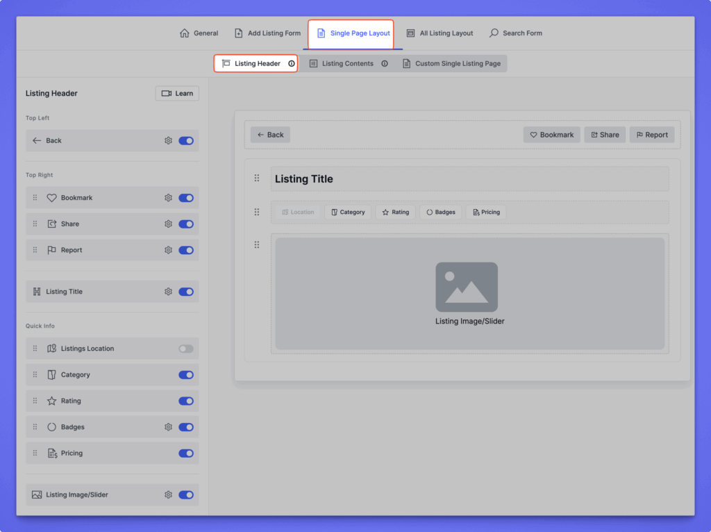 The Single Page Layout settings allow you to control how this page looks and what elements are shown ranging from the header image and title placement to badges, filters, and custom content areas. Whether you want a sleek, minimalist layout or a feature-rich detailed page, this section helps you configure the perfect presentation for your listings.