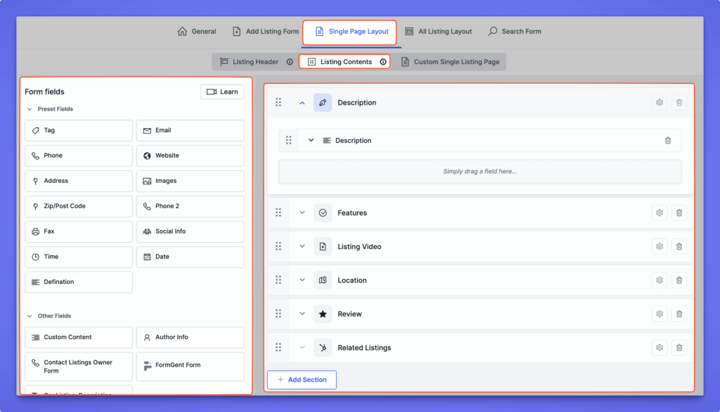 The Listing Contents tab controls the main body area of the single listing page — everything that appears below the header section. It lets you decide which content blocks (like description, features, video, reviews, or related listings) appear, their order, and how they’re structured.