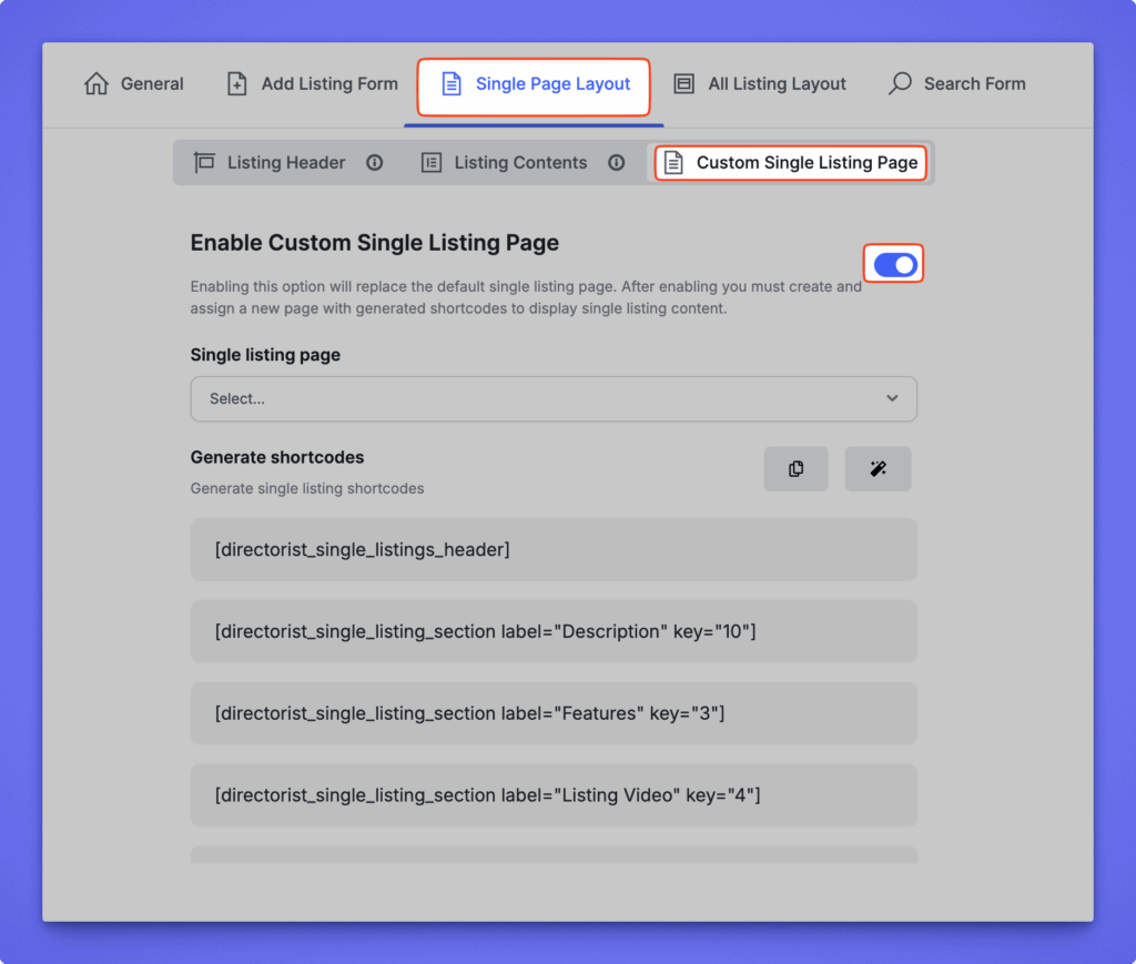 The Custom Single Listing Page option lets you design your own single listing layout using WordPress pages and shortcodes. This feature replaces the default Directorist layout and gives you complete control over the structure and design.